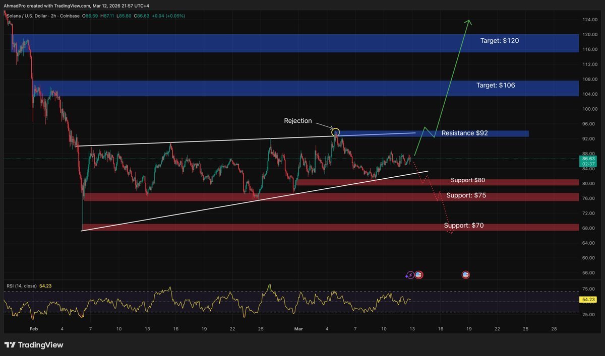 Sin embargo, el movimiento más reciente sufrió un rechazo contundente en los $92, nivel que ahora se consolida como la resistencia clave que separa a SOL de objetivos superiores.
