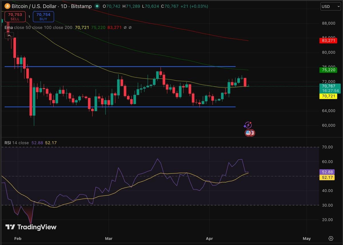 Con un precio actual que ronda los $70.700, Bitcoin se encuentra en una zona de consolidación técnica muy definida. Los operadores vigilan de cerca la resistencia de los $76.000, mientras que el soporte se mantiene firme cerca de los niveles actuales.