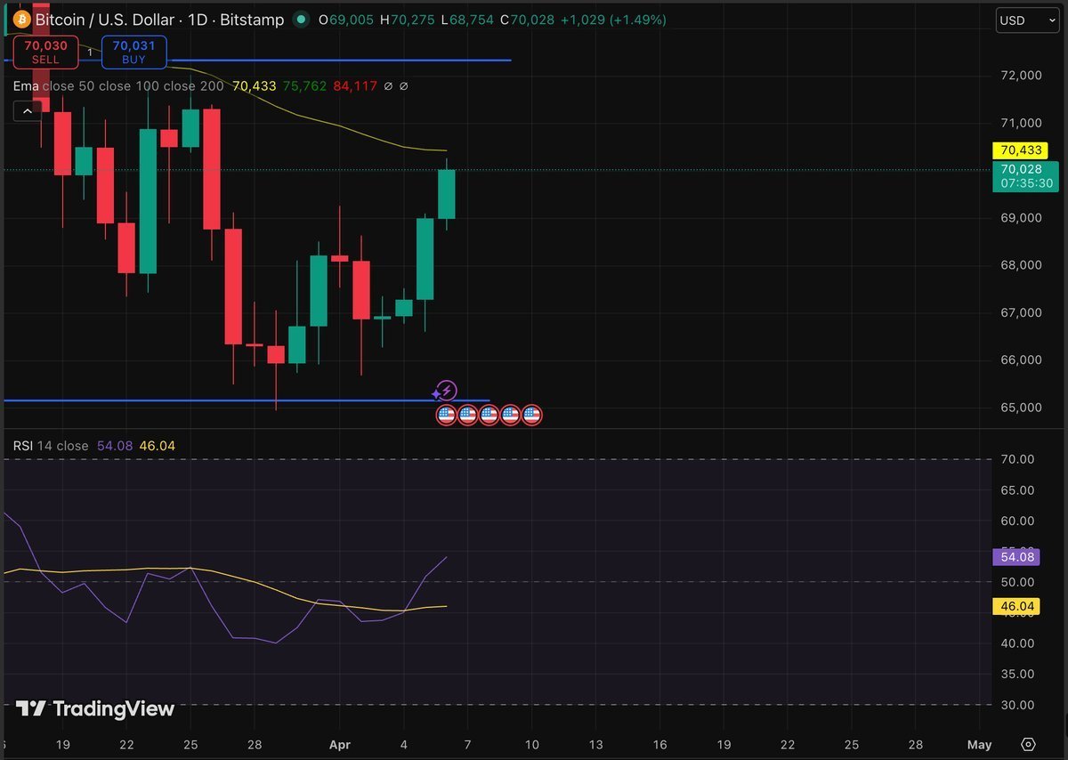 Un cierre diario por encima de los $69.500 abriría el camino hacia los $72.000 e incluso hacia la zona de los $74,000 vista brevemente en marzo.