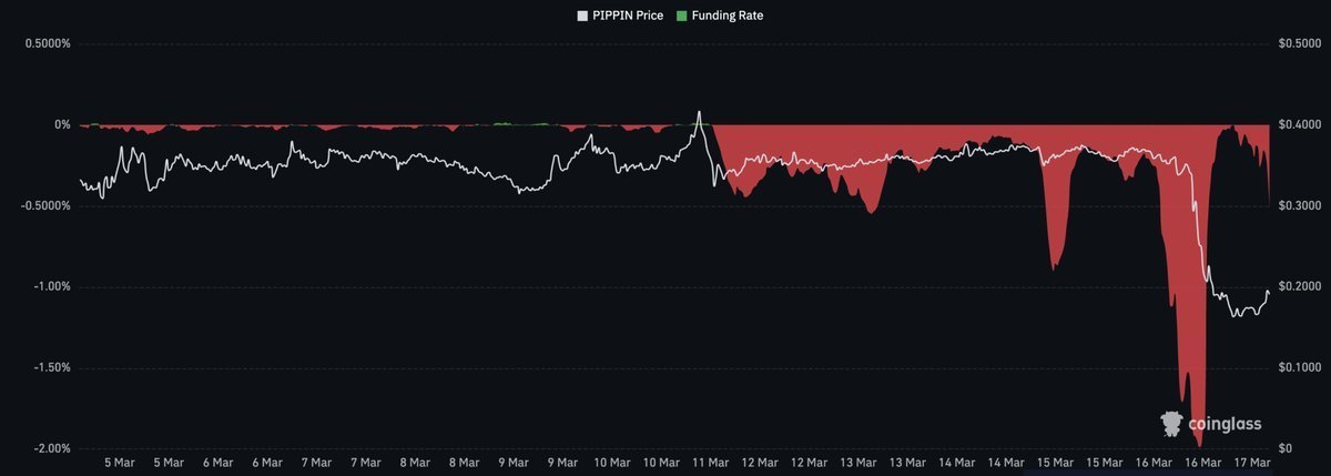 Actualmente, las tasas de financiación (funding rates) se han vuelto negativas, situándose en -0,0053%, lo que indica que los vendedores en corto han tomado el control total. La estructura de mercado de PIPPIN crypto se ha desacoplado por completo de la tendencia alcista que aún mantienen otros activos como Pepe.