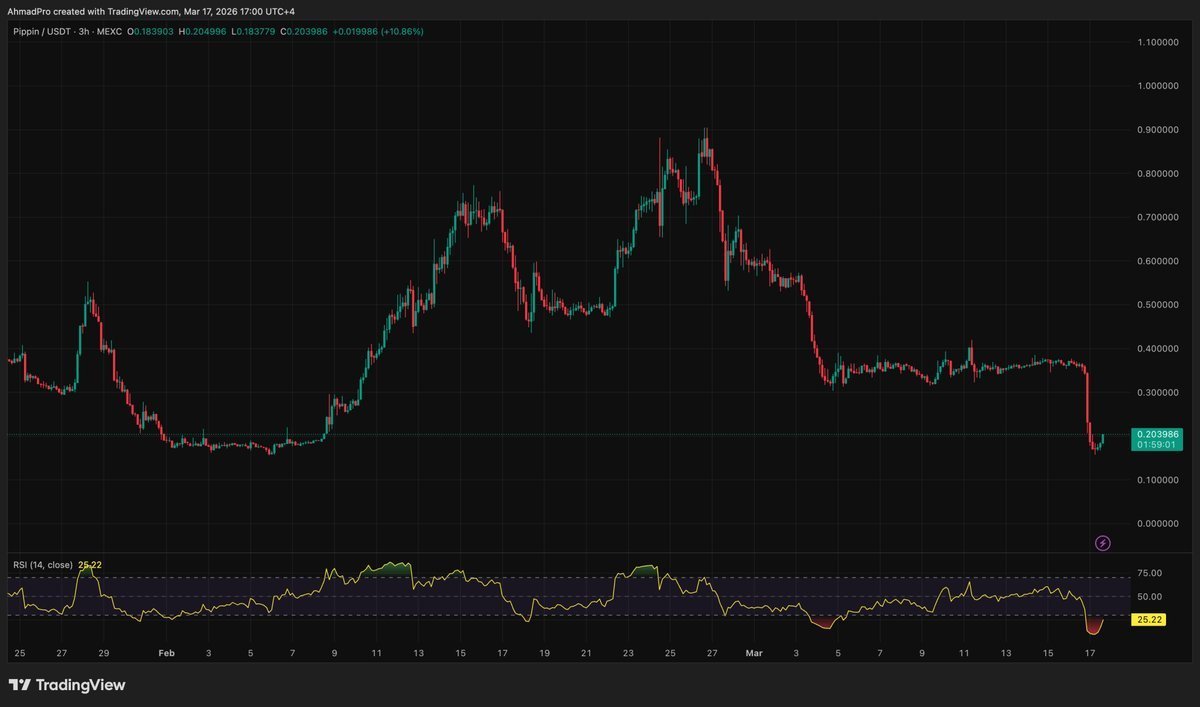 Tras una subida meteórica desde los 0,18$ hasta los 0,93$ a finales de febrero, PIPPIN ha devuelto prácticamente todas sus ganancias. Al situarse ahora en el rango de los 0,2$, el gráfico sugiere que el mercado ha revalorizado el activo eliminando todo el exceso especulativo.