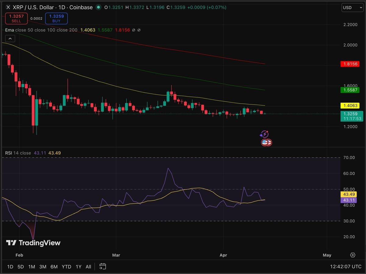 En el corto plazo, el precio de XRP se sitúa en los 1,36 dólares, por debajo de su media móvil simple (SMA) de 50 días de 1,40 dólares, lo que representa una advertencia técnica importante. El RSI se encuentra en 43, indicando una posición neutral, mientras que solo el 40% de los últimos 30 días han cerrado en verde.