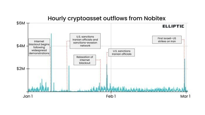 Los datos de Elliptic revelan que las salidas netas en Nobitex saltaron un 700% en las 48 horas posteriores a los ataques.