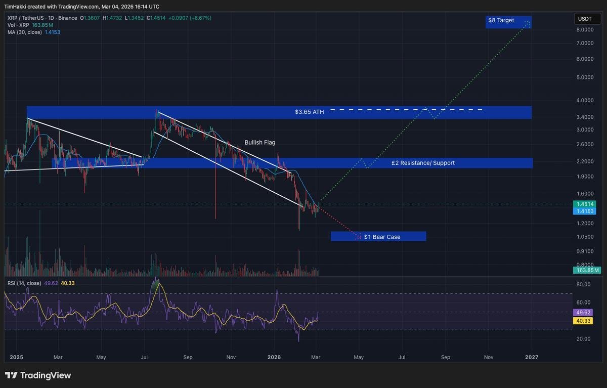 Actualmente, XRP cotiza cerca de los $1,42 pero las proyecciones de Claude apuntan a un posible ascenso hacia los $8 antes de que termine el año, lo que supondría multiplicar su valor por seis.