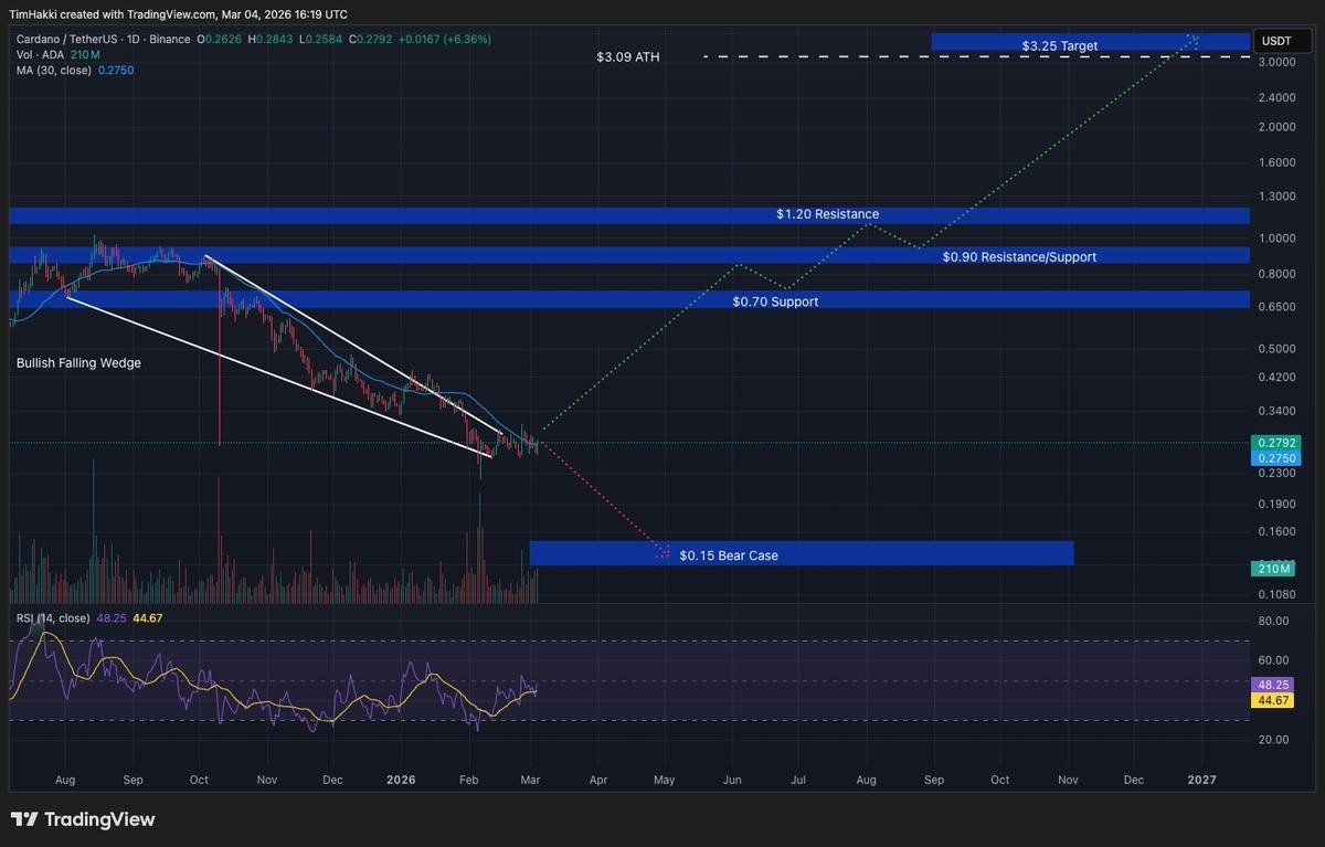 Claude sugiere que ADA podría escalar desde los $0.28 actuales hasta casi $3.25 para finales de año, superando su pico de $3.09 de 2021.