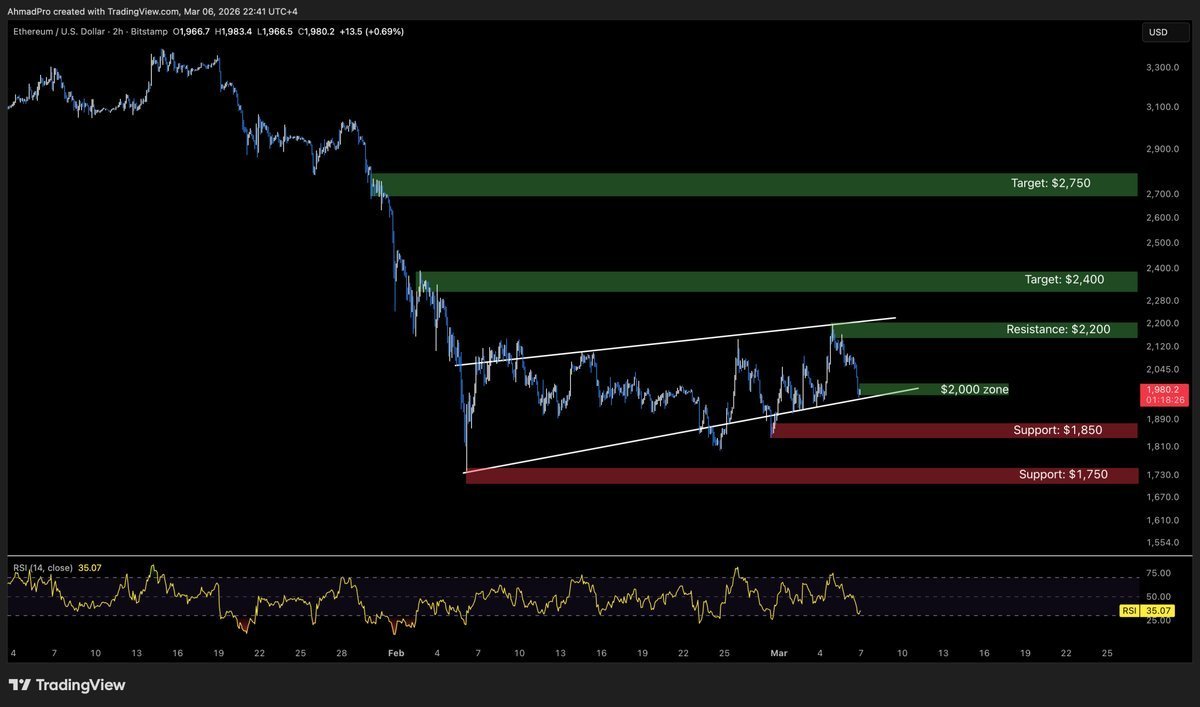 Desde una perspectiva técnica, la predicción de precio de Ethereum se está comprimiendo en una estructura estrecha tras su rebote de febrero. Aunque el precio alcanzó la resistencia de los $2,200, no logró superarla, creando un máximo más bajo.