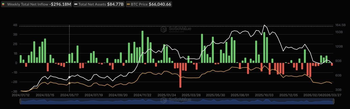 Los ETF de BTC al contado en Estados Unidos registraron salidas netas de aproximadamente 296 millones de dólares entre el 24 y el 27 de marzo, en medio de un giro generalizado hacia la aversión al riesgo que ha tomado fuerza en los mercados globales.