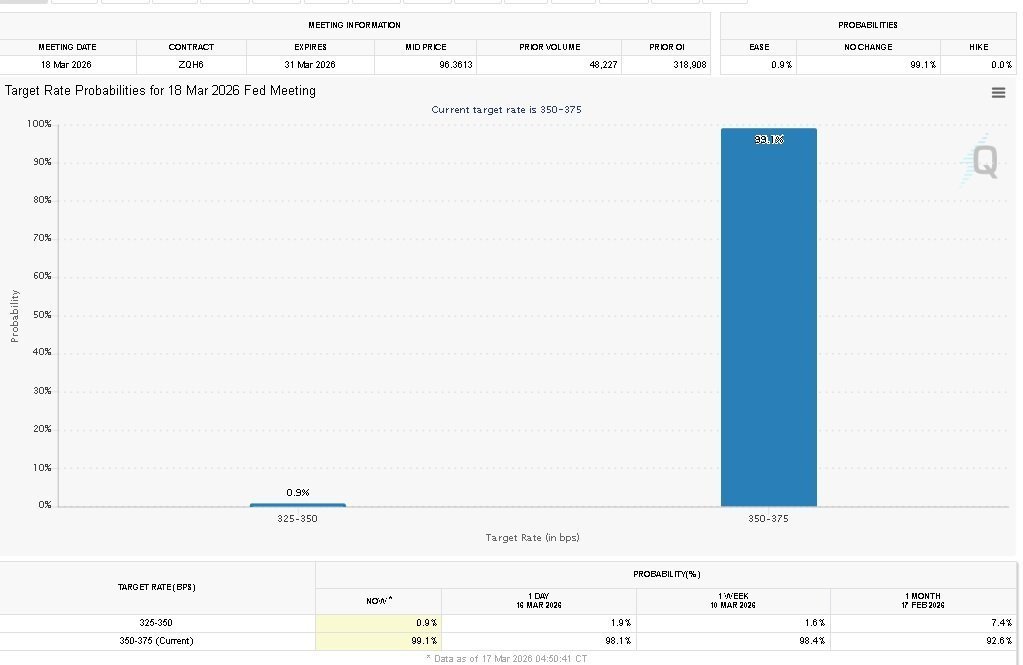 - Los mercados de futuros descuentan casi totalmente un recorte en la reunión del FOMC del 17 de marzo.