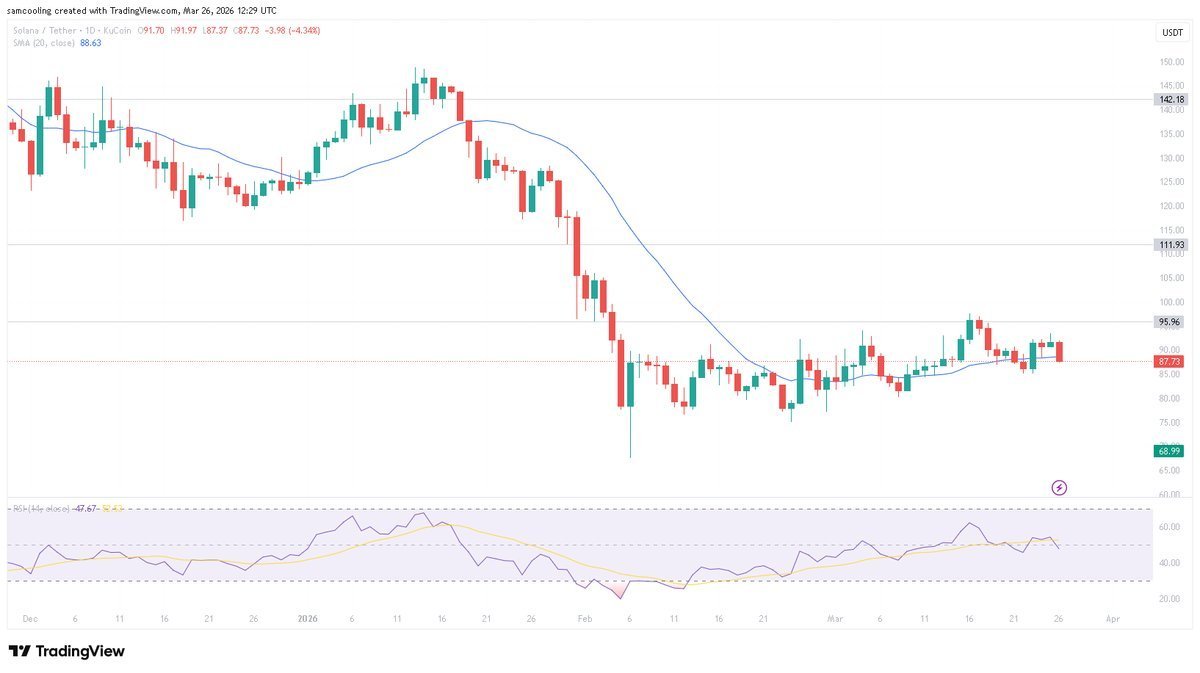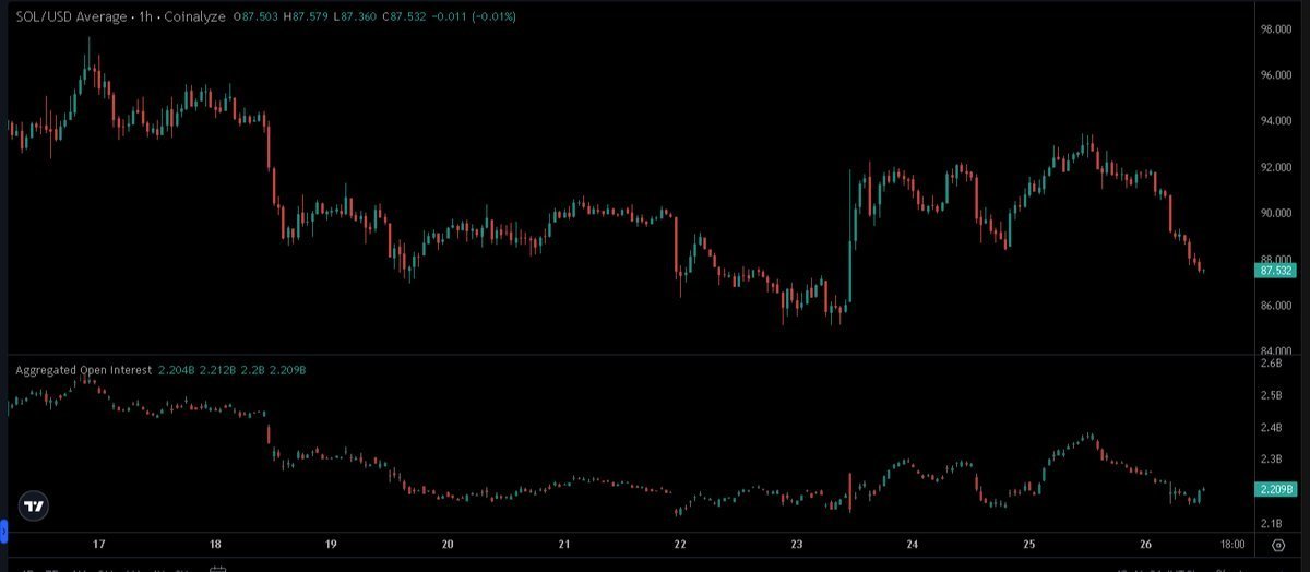 La criptomoneda Solana (SOL) se encuentra actualmente cotizando en torno a los $87, lo que representa una caída del 69% desde su máximo histórico cercano a los $295,91 en enero de 2025.