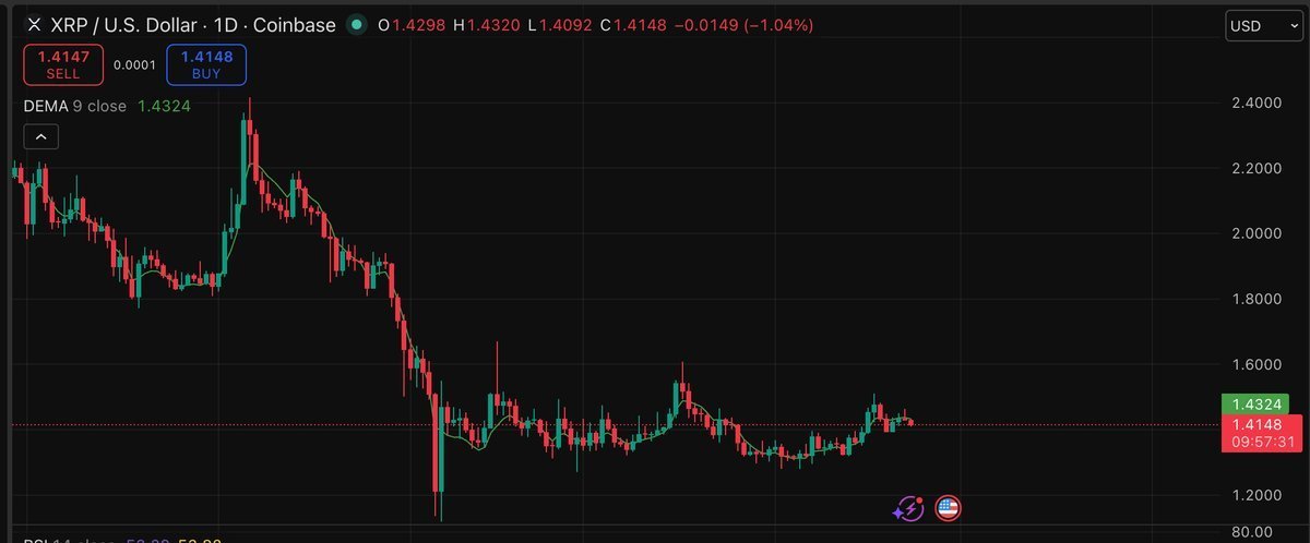 La estructura técnica de XRP se muestra inusualmente sólida en este momento. El precio se mantiene en un rango estable de $1,40, cotizando por encima de la media móvil exponencial (EMA) de 50 días ($1,35) y la de 100 días ($1,37).